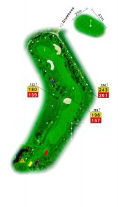 Longhitter spielen direkt in die Kurve und haben dann freie Sicht auf die Fahne. Das Grün selbst ist zwar schön groß, fällt aber nach vorne und nach rechts ab. Aus der Kurve direkt angespielt rollt der Ball auf dem Grün oft nach rechts weg.