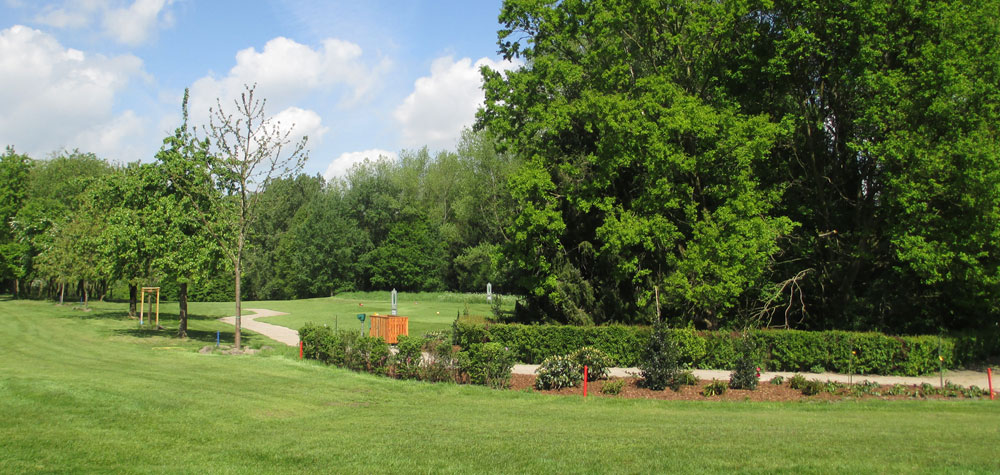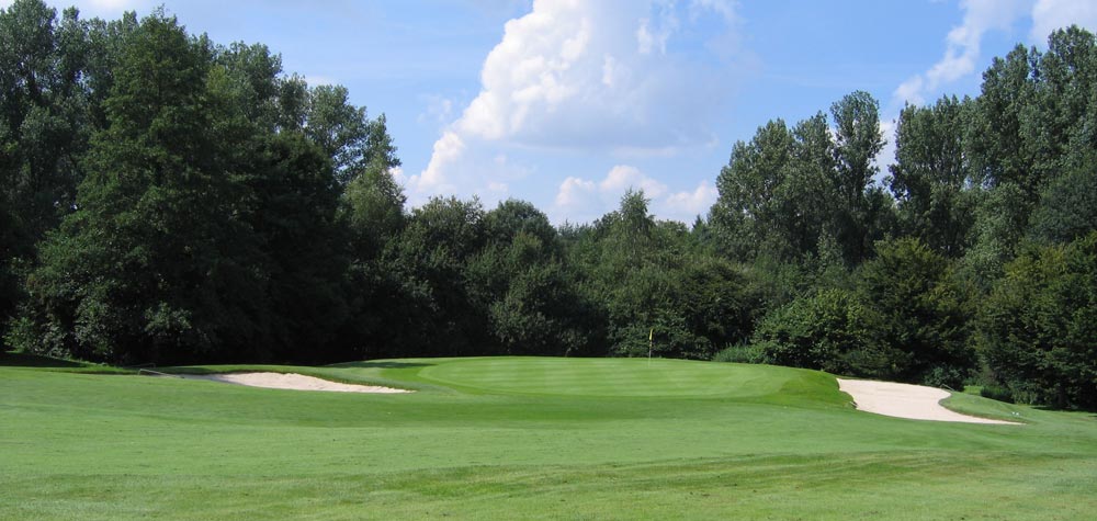 Die Bahn fällt aber auf der hinteren Hälfte nach unten ab. Dadurch kann man vom Abschlag aus zwar noch die Fahne, aber nicht mehr die drei Grünbunker sehen.