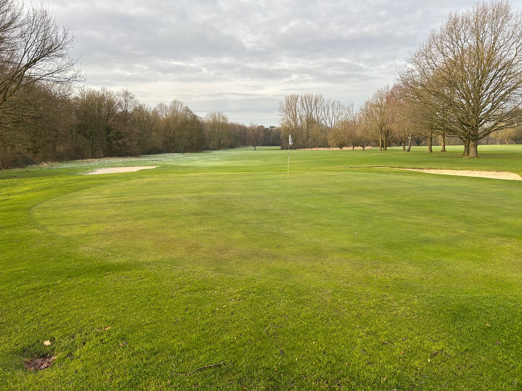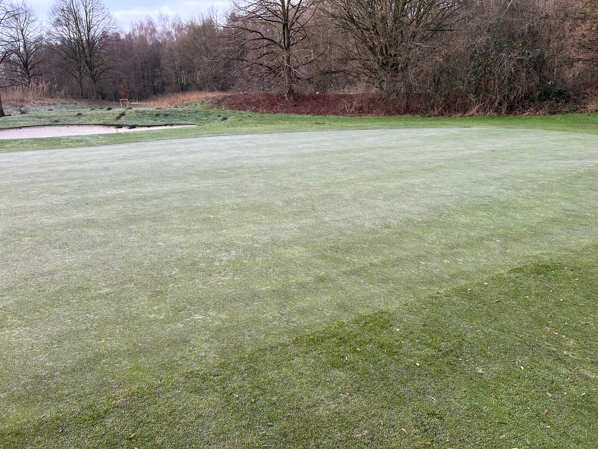 Ist das Grün weiß gefroren (Bild Grün der Bahn 11) muss unbedingt das Wintergrün angespielt werden, um Schäden an den Gräsern zu vermeiden.